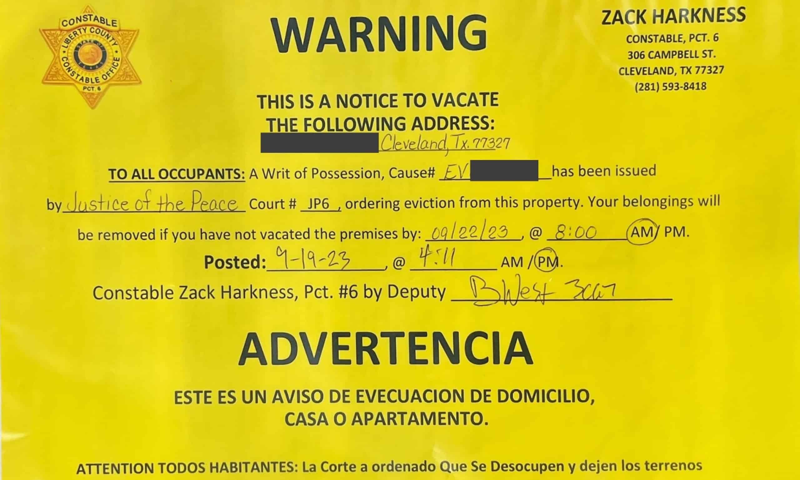 Aviso de desalojo colocado por la oficina del Distrito Policial 6 del condado Liberty, Texas, en la propiedad de Karla García Ramos el 19 de septiembre de 2023. El documento informa a los ocupantes que un juez de paz ordenó la restitución del inmueble y fija fecha y hora para abandonar la vivienda, bajo advertencia de que las pertenencias serán retiradas si no se cumple la orden judicial. Imagen cortesía de La Esquina TX